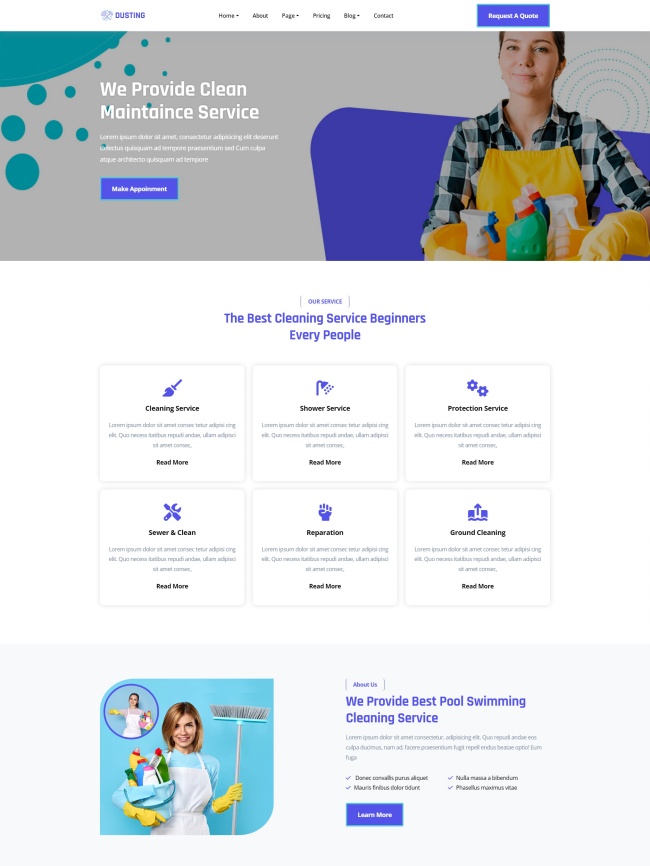 简介:家政清洁服务公司宣传网站模板是一款适合从事家政清洁服务行业网站模板下载。提示:本模板调用到谷歌字体库,可能会出现页面打开比较缓慢。