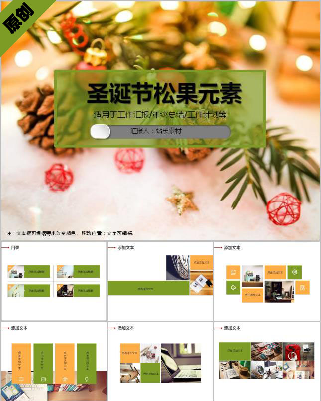 简介:圣诞节松果元素ppt模板适用于圣诞节设计应用。本作品提供PPT,PPTX格式文件,由【站长素材】原创,转载请注明出处!