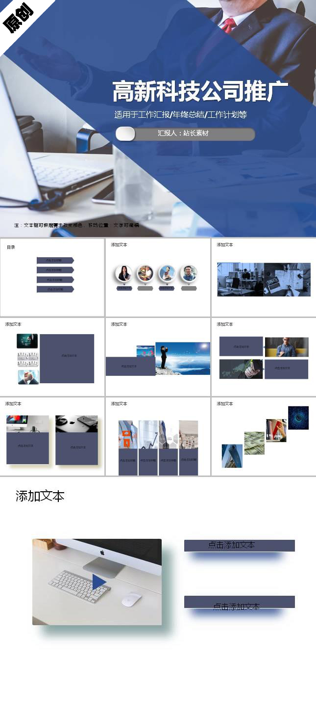 简介:高新科技公司推广ppt制作模板适用于商务办公设计应用。本作品提供PPT,PPTX格式文件,由【站长素材】原创,转载请注明出处!