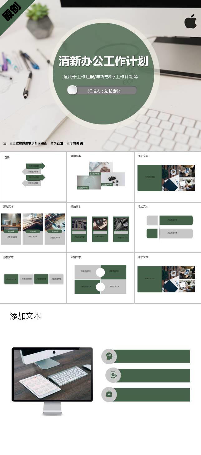简介:清新办公工作计划ppt模板适用于商务办公设计应用。本作品提供PPT,PPTX格式文件,由【站长素材】原创,转载请注明出处!