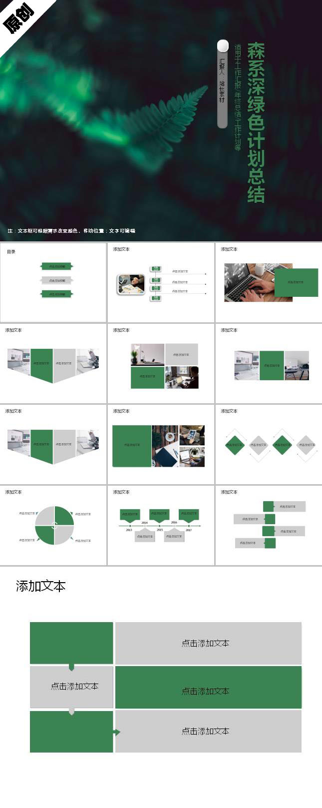 简介:森系深绿色计划总结PPT模板适用于商务办公设计应用。本作品提供PPT,PPTX格式文件,由【站长素材】原创,转载请注明出处!