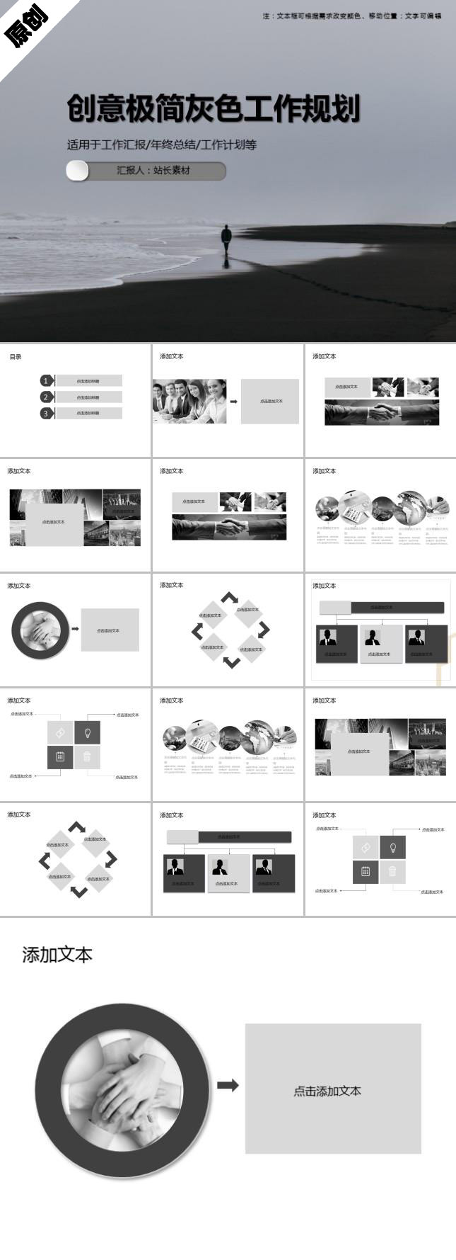 简介:创意极简灰色工作规划PPT模板适用于商务办公设计应用。本作品提供PPT,PPTX格式文件,由【站长素材】原创,转载请注明出处!