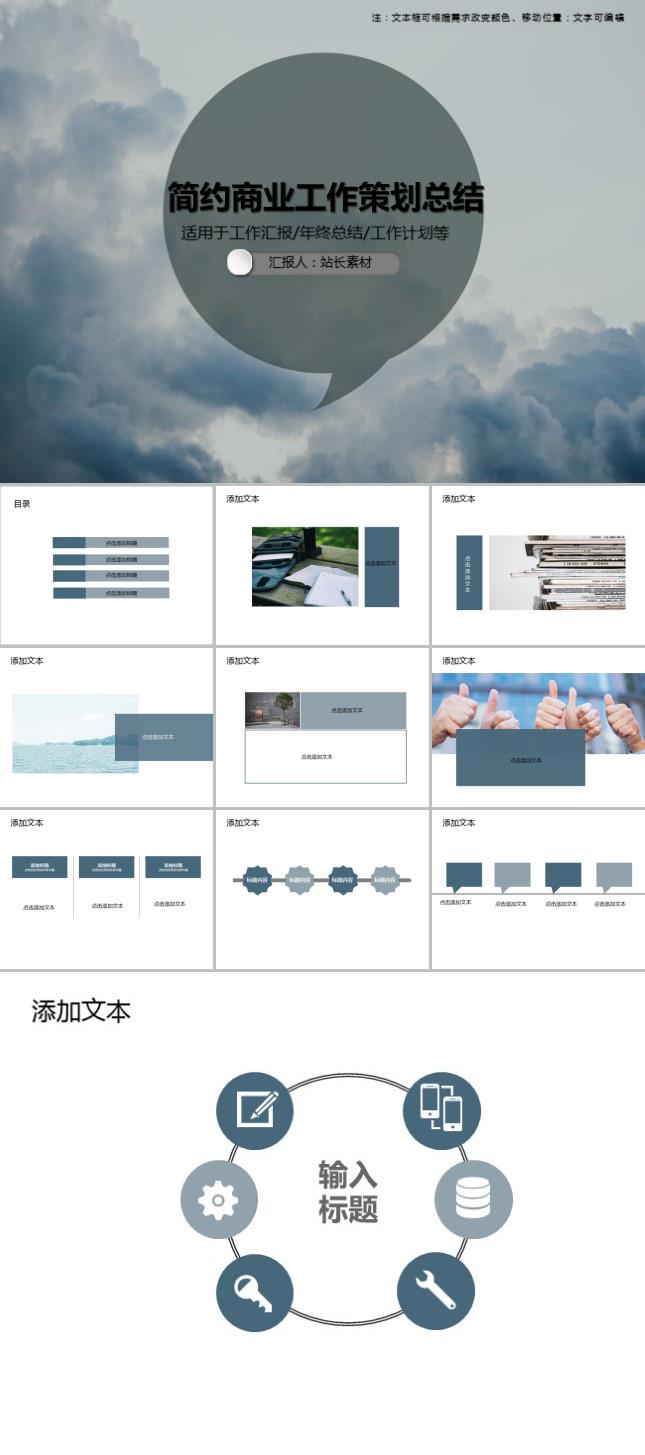 简介:简约商业工作策划总结PPT模板适用于商务办公设计应用。本作品提供PPT,PPTX格式文件,由【站长素材】原创,转载请注明出处!