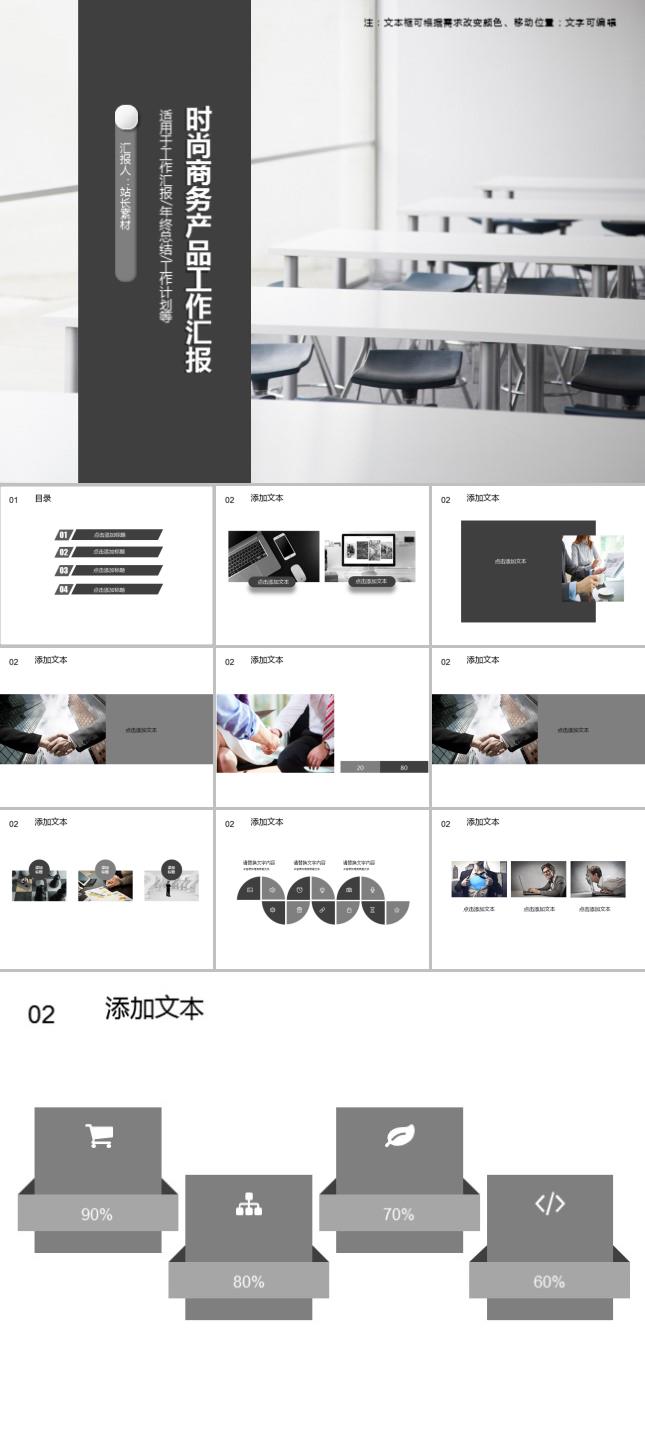 简介:时尚商务产品工作汇报PPT模板适用于商务办公设计应用。本作品提供PPT,PPTX格式文件,由【站长素材】原创,转载请注明出处!