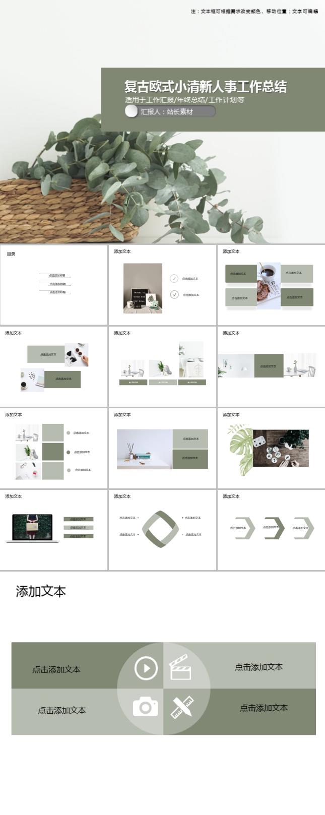 简介:复古欧式小清新人事工作总结PPT模板适用于商务办公设计应用。本作品提供PPT,PPTX格式文件,由【站长素材】原创,转载请注明出处!