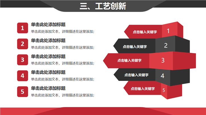 简介:经典红黑简约商务公司介绍企业文化PPT模板以黑红为封面基础色调,并贯穿整套模板,内容涵盖公司简介、企业荣誉、核心优势、产品介绍、工艺创新、企业文化、团队建设、案例展示、合作客户等方面模块,通用于公司简介、企业文化、产品介绍等方面演示模板。本作品提供pptx格式文件下载,站长素材PPT大全提供精选的PPT模板素材。