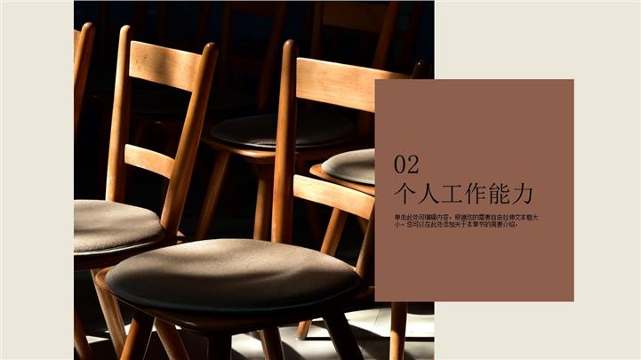 简介:2023时尚设计求职竞聘报告ppt模板,棕色为主色调,简约几何色块装饰,整体界时尚画册风格,包含个人基本情况、个人工作能力、岗位胜任能力、未来职业规划、感谢页等主要模块,图文排版页面为主,框架结构完整,动态播放效果。适用于岗位竞聘、求职竞聘、个人履历、职场规划、述职报告、升职竞聘、述职总结报告等相关演示模板。主体文字及图片可替换修改,文字修改均可直接点击文本框进行编辑,图片更改可选中图片后单击鼠标右键插入更换图片,也可根据自身需求增加和删除。 本作品提供pptx格式文件下载,站长素材PPT大全提供精选的PPT模板素材。