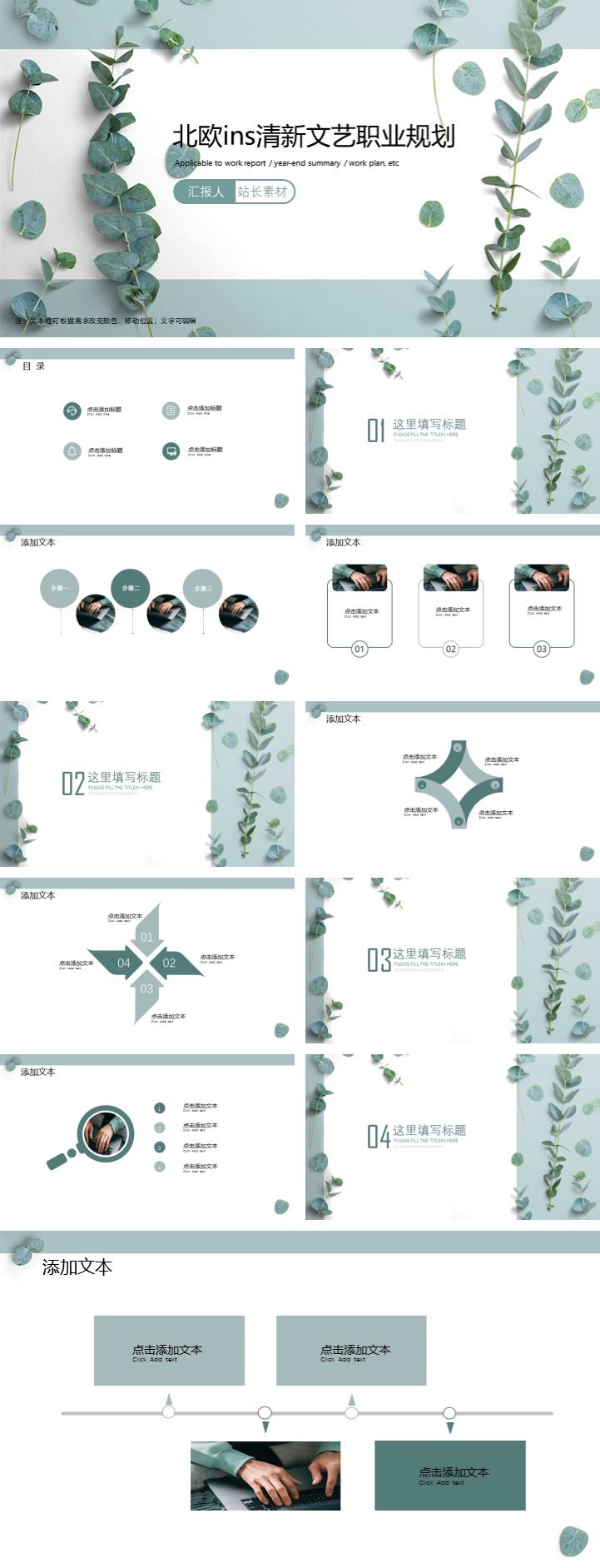 简介:北欧ins清新文艺职业规划ppt模板,浅绿色为主色调,绿叶为装饰设计,整体界面文艺小清新风格,适用于职业规划、新员工入职培训、职业生涯规划、职业生涯、职业规划培训等相关主题设计应用。主体文字及图片可替换修改,文字修改均可直接点击文本框进行编辑,图片更改可选中图片后单击鼠标右键插入更换图片,也可根据自身需求增加和删除。本作品提供PPT,PPTX格式文件,由【站长素材】原创,转载请注明出处!