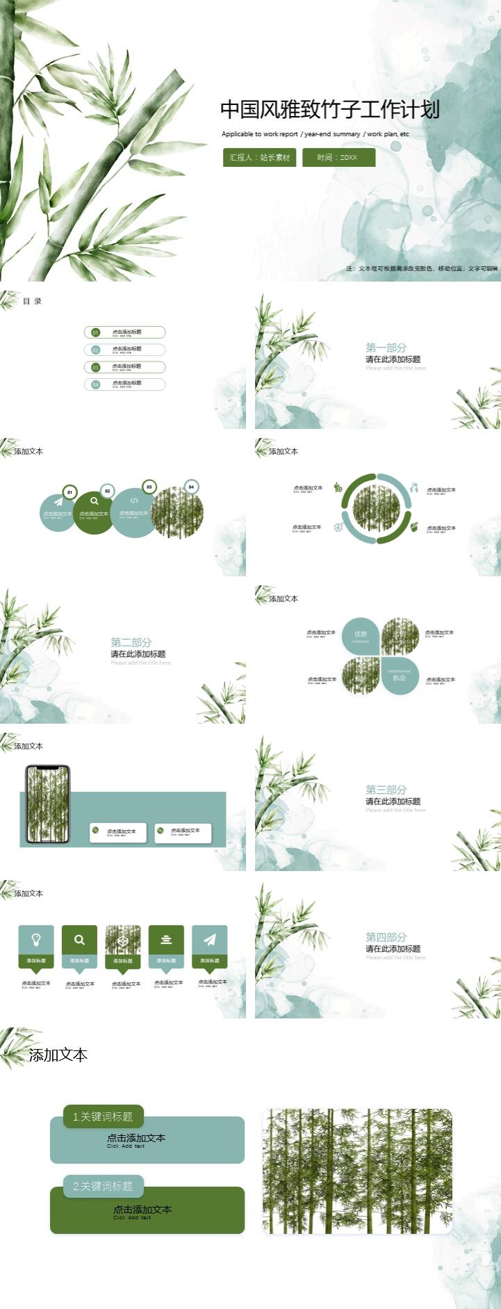 简介:水墨中国风雅致竹子工作计划ppt模板,绿色为主色调,中国风设计,竹子为设计元素,整体界面雅致风格,适用于商务汇报、计划总结、市场调研、品牌总结、工作计划、商务礼仪、培训课件、礼仪培训、企业礼仪培训、员工培训等相关主题设计应用。主体文字及图片可替换修改,文字修改均可直接点击文本框进行编辑,图片更改可选中图片后单击鼠标右键插入更换图片,也可根据自身需求增加和删除。 本作品提供PPT,PPTX格式文件,由【站长素材】原创,转载请注明出处!