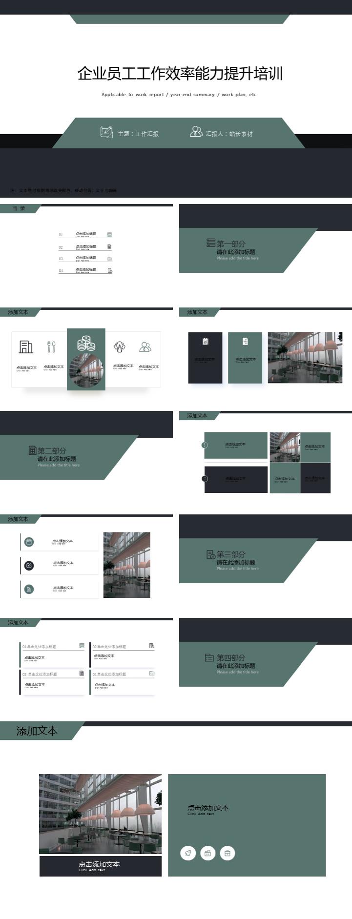 简介:企业员工工作效率能力提升培训ppt模板,浅绿色、深灰色搭配为主,几何元素设计,整体界面简洁大方、商务风格,适用于工作效率提升、工作能力培训、个人能力培训等相关主题设计应用。主体文字及图片可替换修改,文字修改均可直接点击文本框进行编辑,图片更改可选中图片后单击鼠标右键插入更换图片,也可根据自身需求增加和删除。本作品提供PPT,PPTX格式文件,由【站长素材】原创,转载请注明出处!