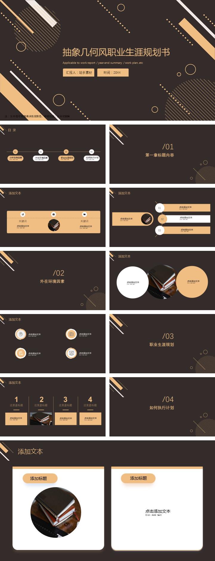 简介:抽象几何风职业生涯规划书ppt模板,棕色、米黄色搭配为主,动感几何元素设计,整体界面抽象商务风格,主要包含分析自身因素、外在环境因素、职业生涯规划、如何执行计划等模块内容,适用于新员工入职培训、职业生涯规划、职业生涯、职业规划培训等相关主题设计应用。主体文字及图片可替换修改,文字修改均可直接点击文本框进行编辑,图片更改可选中图片后单击鼠标右键插入更换图片,也可根据自身需求增加和删除。 本作品提供PPT,PPTX格式文件,由【站长素材】原创,转载请注明出处!