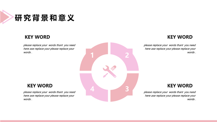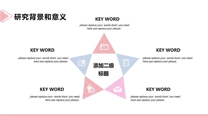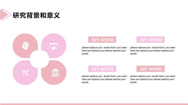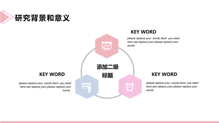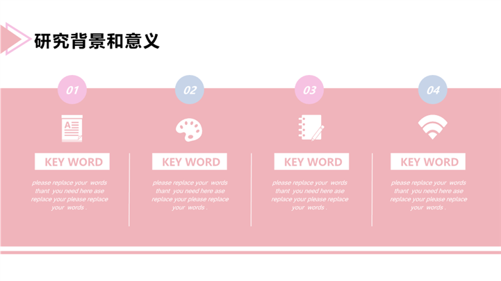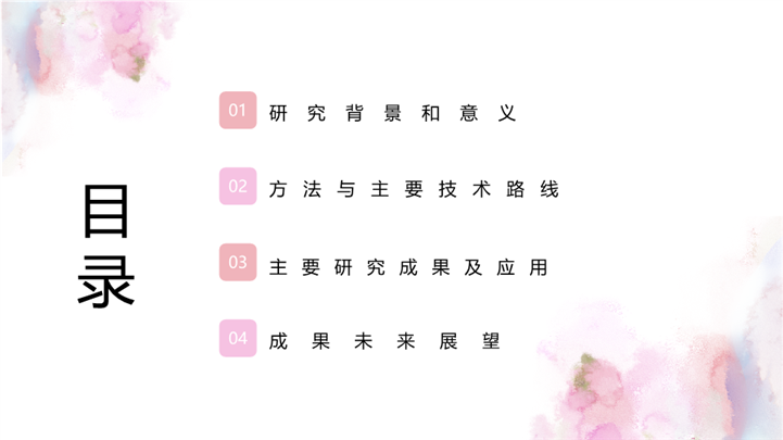 简介:唯美晕染风毕业开题答辩ppt模板,粉色为主色调,整体界面唯美风格,适用于开题报告、学术报告、论文答辩、论文答辩、开题PPT、开题答辩、毕业答辩、研究生答辩、考硕士研究生答辩、复试答辩等相关主题设计应用。主体文字及图片可替换修改,文字修改均可直接点击文本框进行编辑,图片更改可选中图片后单击鼠标右键插入更换图片,也可根据自身需求增加和删除。本作品提供PPTX格式文件,转载请注明出处!