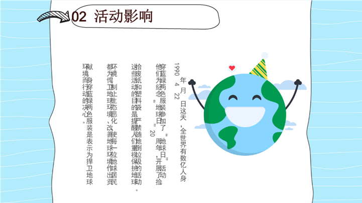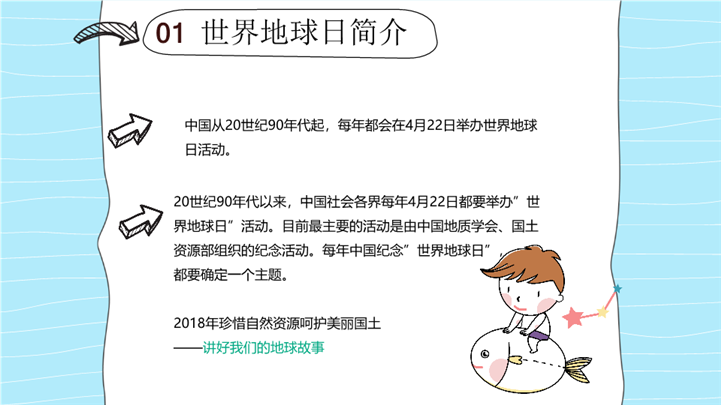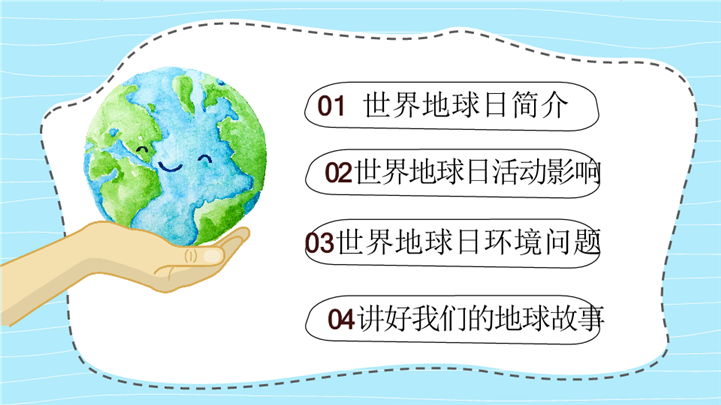 简介:卡通风4.22世界地球日主题班会ppt模板,浅蓝色为主色调,整体界面卡通风格,适用于环保宣传、环保教育活动、地球日相关的公益活动或校园活动策划、环保教育课件、世界地球日、世界地球日班会等相关主题设计应用。主体文字及图片可替换修改,文字修改均可直接点击文本框进行编辑,图片更改可选中图片后单击鼠标右键插入更换图片,也可根据自身需求增加和删除。本作品提供PPTX格式文件,转载请注明出处!