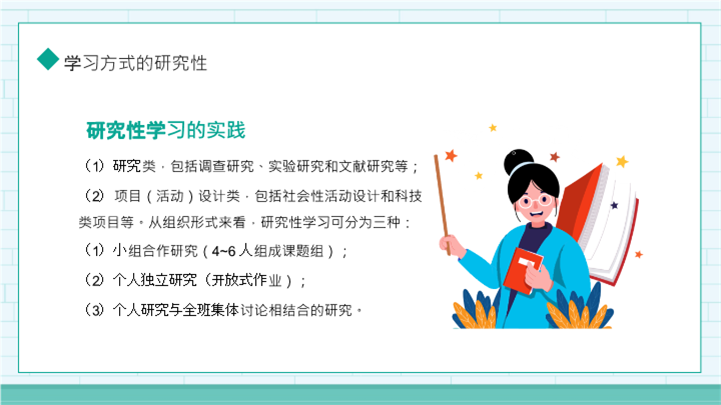 简介:研究性教育研讨会学习报告ppt模板,绿色为主色调,整体界面卡通风格,适用于研讨会、学习报告、教育讲座、工作复盘、月度总结、月度复盘、计划总结、商务总结、工作总结、总结汇报、商务汇报等相关主题设计应用。主体文字及图片可替换修改,文字修改均可直接点击文本框进行编辑,图片更改可选中图片后单击鼠标右键插入更换图片,也可根据自身需求增加和删除。本作品提供PPTX格式文件,转载请注明出处!