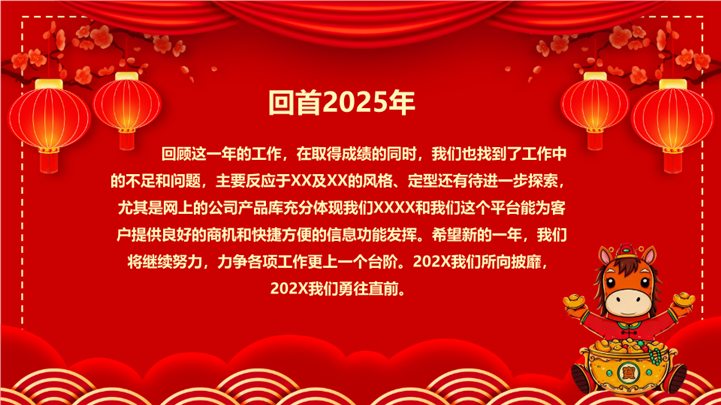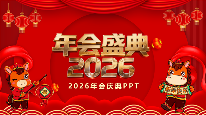 简介:2026马年红色喜庆企业年会盛典PPT模板,辞旧迎新,金马贺岁!这款2026马年红色喜庆年会盛典PPT模板,专为企业年终晚会设计。封面采用红灯笼、祥云与Q版卡通马元素,营造出浓厚的节日氛围。模板内含回顾2025(卓越成绩)、展望2026(开拓创新)、优秀员工颁奖及文艺汇演节目单版式,助您举办一场红红火火的年度盛会。主体文字及图片可替换修改,文字修改均可直接点击文本框进行编辑,图片更改可选中图片后单击鼠标右键插入更换图片,也可根据自身需求增加和删除。 本作品提供PPTX格式文件,转载请注明出处!