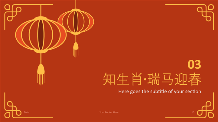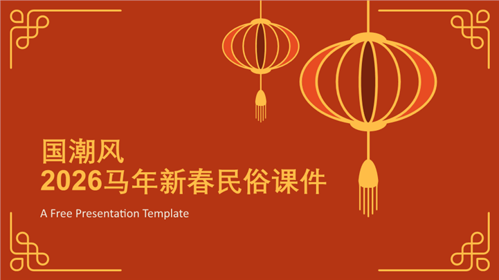 简介:国潮风2026马年新春民俗课件ppt模板,画面中心为2026书法字体与奔腾的剪纸马形象,背景辅以中式窗棂、红灯笼和金色祥云图案。色彩以高饱和度中国红为主,搭配烫金质感,具有强烈的东方美学特征和节日庆典氛围。迎接2026金马年!这款国潮风新春民俗课件PPT模板,专为学校教育及文化宣传设计。融合中国红、剪纸马、祥云纹样等传统元素与现代设计感。内含春节起源、南北习俗差异、传统美食介绍及趣味猜灯谜版式,是举办春节主题班会或传统文化讲座的最佳选择。主体文字及图片可替换修改,文字修改均可直接点击文本框进行编辑,图片更改可选中图片后单击鼠标右键插入更换图片,也可根据自身需求增加和删除。 本作品提供PPTX格式文件,转载请注明出处!