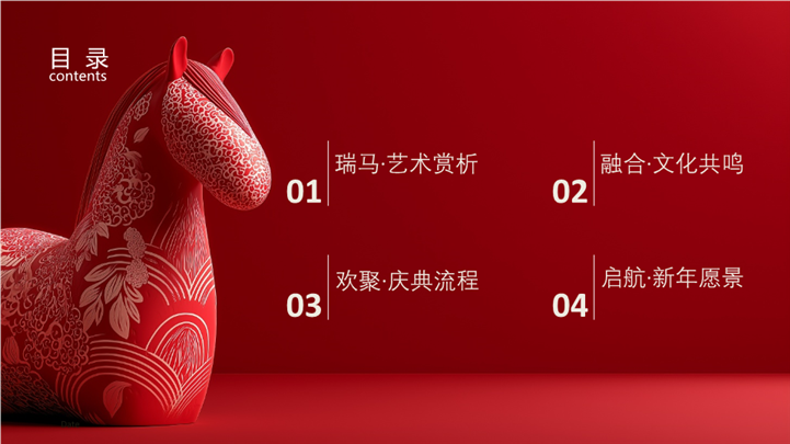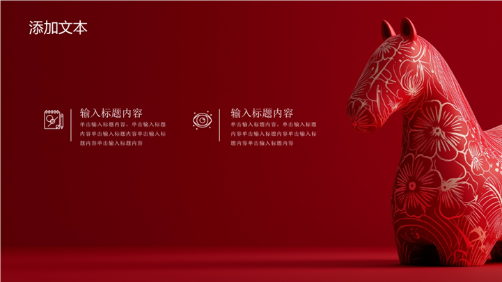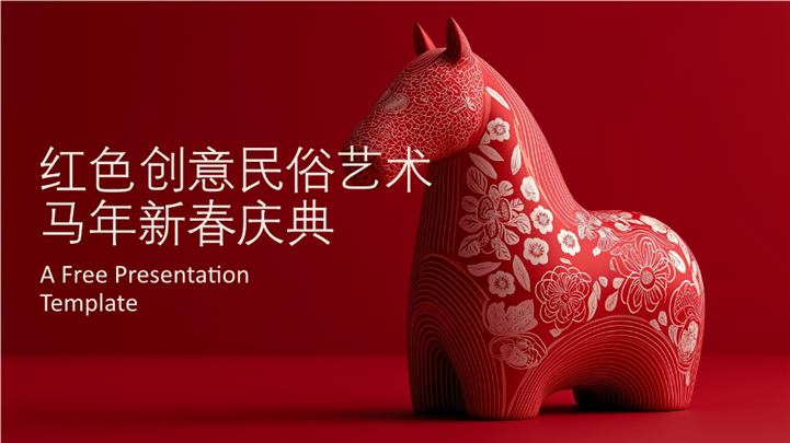 简介:红色创意民俗艺术马年新春庆典ppt模板,适用于马年(马年春节/马年促销/马年工作计划/马年总结)教育培训(瑞典/北欧文化介绍、世界民俗艺术赏析)、节日庆典(圣诞节活动策划、新年贺卡)、营销宣传(手工艺品推广、旅游局宣传)、艺术设计(色彩与图案设计课程)等相关主题设计应用。主体文字及图片可替换修改,文字修改均可直接点击文本框进行编辑,图片更改可选中图片后单击鼠标右键插入更换图片,也可根据自身需求增加和删除。 本作品提供PPTX格式文件,转载请注明出处!