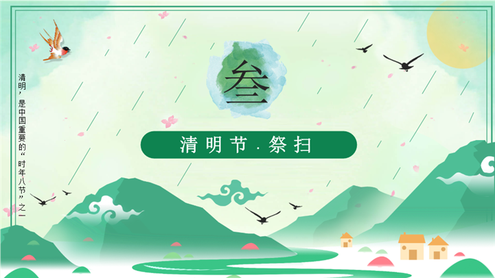 简介:清新国风春日清明节气民俗文化介绍ppt模板,适用于学校/社区/单位文明祭扫宣传、主题班会、节气文化讲座、节日节气宣讲、文明祭扫倡议、文化讲堂、校园主题班会等相关主题设计应用。主体文字及图片可替换修改,文字修改均可直接点击文本框进行编辑,图片更改可选中图片后单击鼠标右键插入更换图片,也可根据自身需求增加和删除。本作品提供PPTX格式文件,转载请注明出处!