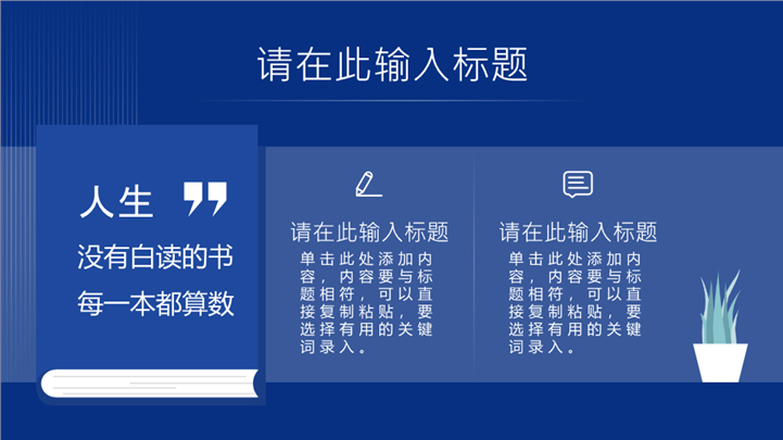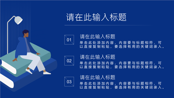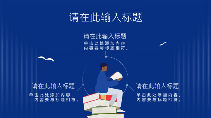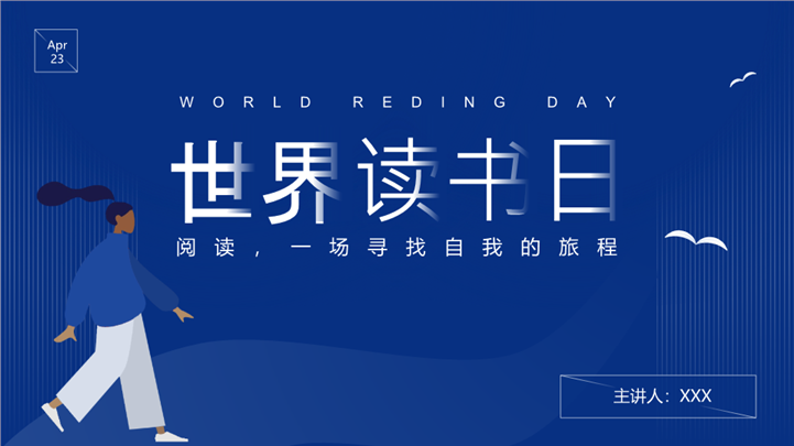 简介:深蓝简约插画风世界读书日活动ppt模板,适用于世界读书日主题班会、校园阅读推广宣讲、教育培训课件 、读书会活动策划等相关主题设计应用。主体文字及图片可替换修改,文字修改均可直接点击文本框进行编辑,图片更改可选中图片后单击鼠标右键插入更换图片,也可根据自身需求增加和删除。本作品提供PPTX格式文件,转载请注明出处!