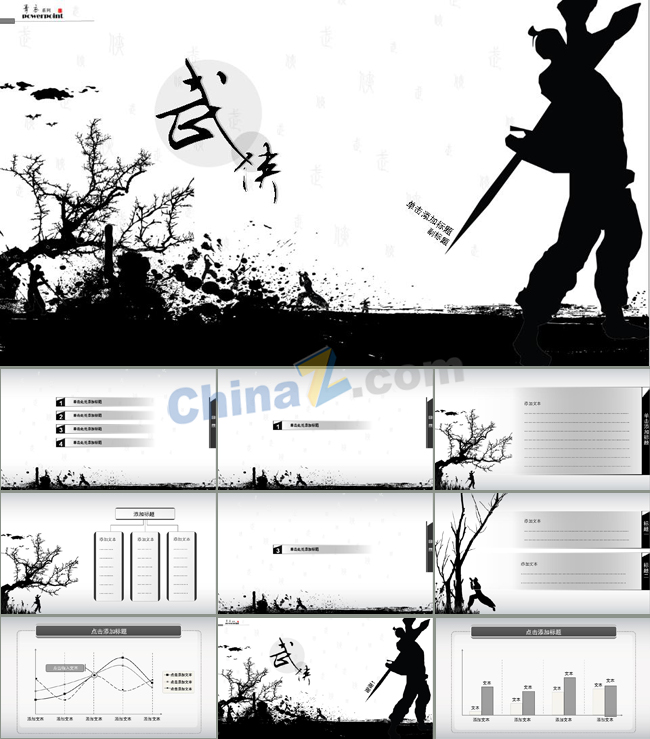 简介:水墨 武侠小说 灰色 设计 树木 人物 英雄 ppt模板下载