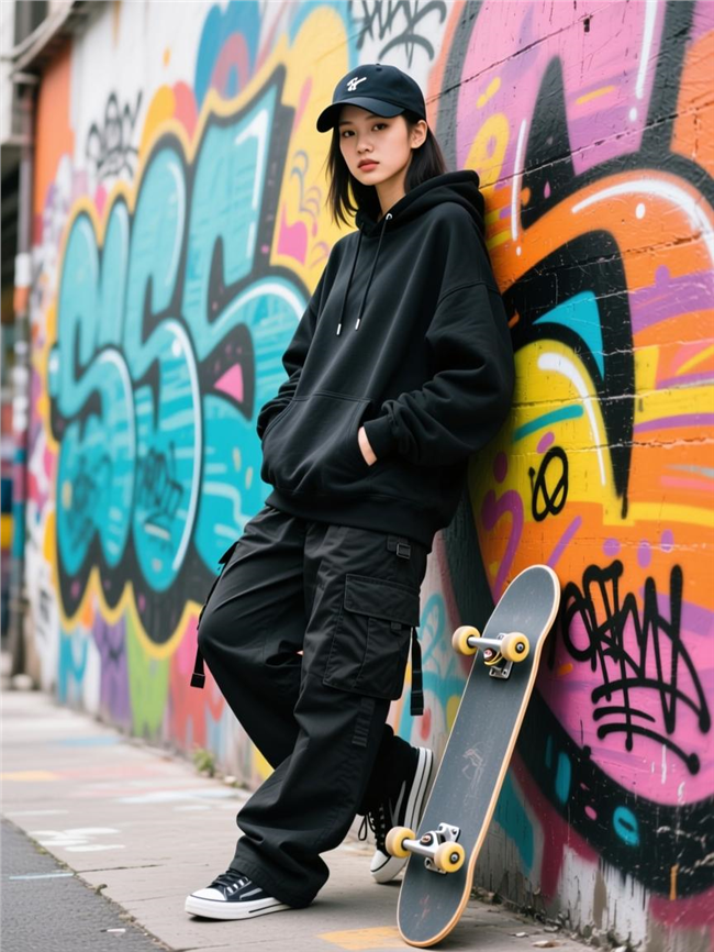 简介:城市街头涂鸦墙滑板美女图片 城市街头的涂鸦墙前,穿黑色卫衣和工装裤的女生,戴着棒球帽,双手插兜,身体微微倾斜靠在墙上,眼神酷拽,脚边放着滑板,背景是色彩鲜艳的涂鸦,街头感十足,高饱和色调,动态抓拍 图片大全 高清图片下载