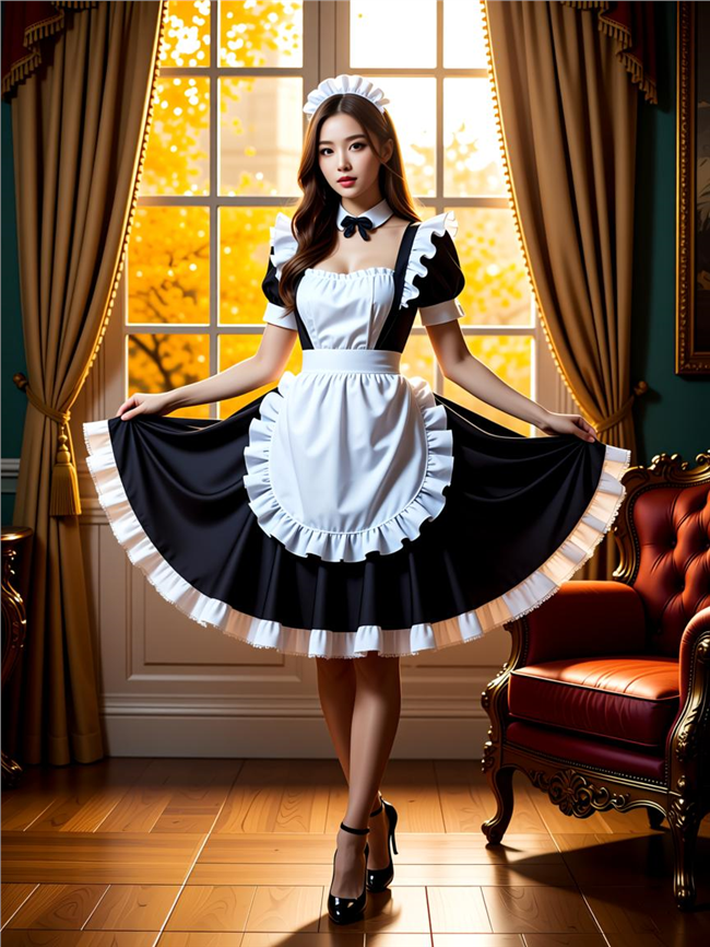 简介:室内女仆装美女写真图片 一位穿着经典女仆装的美女,站在豪华的维多利亚风格客厅中,姿势优雅,裙摆微微飘动。温暖的金色光线透过窗户洒入,映照出她精致的妆容和服装的细节 图片大全 高清图片下载